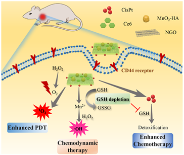 与此同时,丁劲松-周文虎教授团队构建了一种复合型的MnO2缀合氧化石墨烯片状纳米体系共递送光敏剂Chlorin e6及化疗药物顺铂,并修饰透明质酸(HA)作为稳定剂及靶向配体。在该复合体系中,MnO2催化产氧及消耗内源性谷胱甘肽;还原产物Mn2+通过芬顿效应发挥化学动力学治疗作用;该工作展现出肿瘤微环境调控型纳米递药体系用于联合治疗的巨大潜力,为设计多功能纳米递药系统用于增强型化疗-光动力联合治疗提供了一种新的思路。本论文以“A Smart MnO2 Doped Graphene Oxide Nanosheet for Enhanced Chemo-Photodynamic Combinatorial Therapy via Simultaneous Oxygenation and Glutathione”为题发表于国产卓越期刊《Acta Pharmaceutica Sinica B》上。论文第一作者为2018级博士研究生刘鹏,该研究得到中南大学科研启动基金、中南大学创新驱动基金、湖南省科协青年人才托举工程和国家自然科学基金资助。