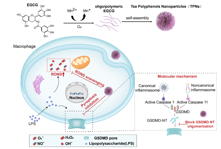 近日,云顶7610线路检测周文虎教授与湘雅三医院吕奔-赵锴教授团队合作,在纳米材料学领域权威期刊《ACS Nano》(IF=15.881, NI指数期刊)上发表了题为“Intrinsic Radical Species Scavenging Activities of Tea Polyphenols Nanoparticles Blocks Pyroptosis in Endotoxin-Induced Sepsis”的最新原创性研究成果。该研究利用金属离子催化下的表没食子儿茶素没食子酸酯(Epigallocatechin gallate, EGCG)氧化自聚,构建一种新型多功能纳米材料。该纳米材料可通过清除活性氮氧自由基和抗细胞焦亡两条途径,实现对脓毒症的治疗。