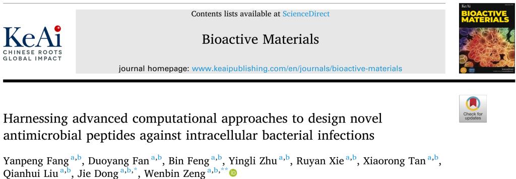 近日,云顶7610线路检测曾文彬教授-董界副教授团队在国际权威期刊《Bioactive Materials》(中科院一区Top期刊,IF = 18.0)上发表了题为“Harnessing advanced computational approaches to design novel antimicrobial peptides against intracellular bacterial infections”的原创性研究论文,为抗胞内菌感染药物开发开辟全新路径。云顶7610线路检测为该论文的第一通讯单位。云顶7610线路检测2024级博士生房岩鹏为第一作者,曾文彬教授和董界副教授为共同通讯作者。