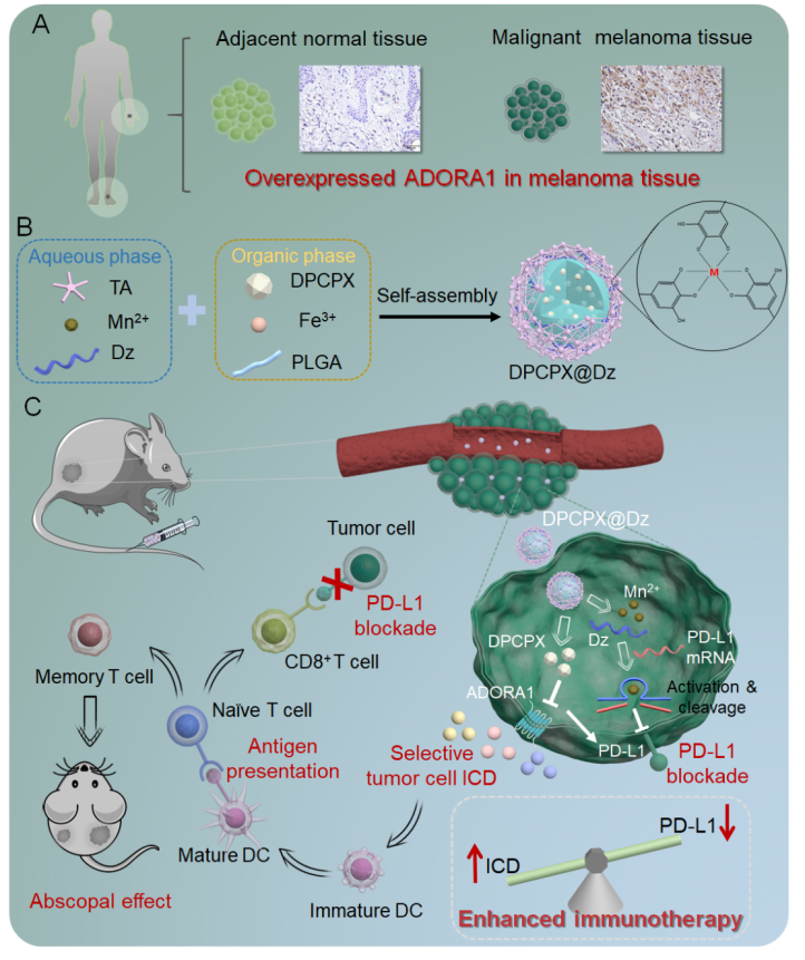 近期,我院周文虎教授团队与中南大学湘雅医院教授团队联合在国际知名期刊《Nano Today》(IF=18.962)上发表了题为“Reversing the negative effect of adenosine A1 receptor-targeted immunometabolism modulation on melanoma by a co-delivery nanomedicine for self-activation of anti-PD-L1 DNAzyme”的最新研究成果。该研究基于腺苷信号通路ADORA1与PD-L1的协同作用机制,构建了一种纳米共递送系统,通过ADORA1靶向拮抗和PD-L1免疫检查点阻断实现高效的黑色素瘤免疫治疗。