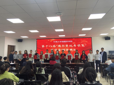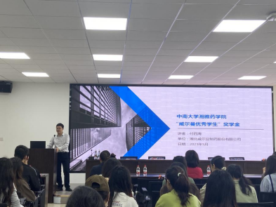 李乾斌副院长宣读获奖名单后,特邀嘉宾为获奖的二十二名同学颁奖,随后学业优秀奖获得者张晓楠发表获奖感言;湘北威尔曼制药股份有限公司、威尔曼广州分公司研发总监付四海博士讲话,进一步增进大家对职业生涯、工作和就业的清晰认识。随后付总监还进行了招聘宣讲,在座同学们对威尔曼制药公司有了更深的了解。