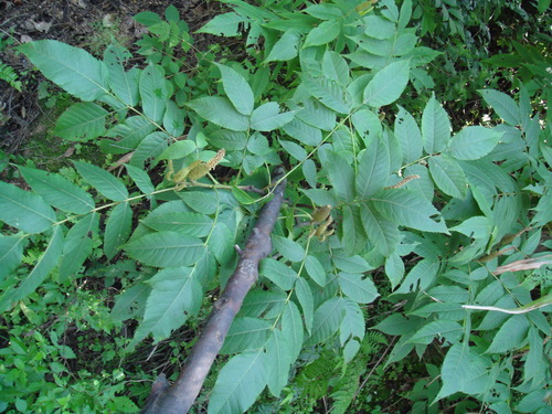 化香树Platycarya strobilacea Sieb. et Zucc,胡桃科化香树属.落叶小乔木,奇数羽状复叶,互生,小叶7-23枚,无柄,薄革质,不等边,稍呈镰状弯曲,基部近圆形,一边略偏斜,先端长渐尖,边缘有重锯齿。花单性或两性,雌雄同株;两性花序和雄花序着生于小枝化香树(图2)顶端或叶腋,排列成伞房状花序束,中央的一条常为两性花序,雄花序在上,雌花序在下;位于两性花序的四周为雄花序,通常3-8条;果序入药,有活血行气;止痛;杀虫止痒之效。用于内伤胸胀;腹痛;跌打损伤;筋骨疼痛;痈肿;湿疮;疥癣。
