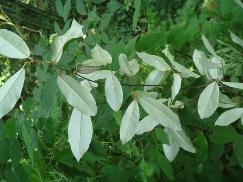 胡颓子E.pungen,又名羊奶子,胡颓子科胡颓子属.大型常绿灌木,通常具刺。枝开展,小枝褐色。叶厚革质,边缘通常波状,下面初具银白色鳞片,后渐变褐色鳞片,花1~3朵或4朵簇生,银白色,下垂,有香气。根有祛风利湿,行瘀止血之效。用于传染性肝炎,小儿疳积,风湿关节痛,咯血,吐血,便血,崩漏,白带,跌打损伤。叶有止咳平喘之效。用于支气管炎,咳嗽,哮喘。果有消食止痢。用于肠炎,痢疾,食欲不振。