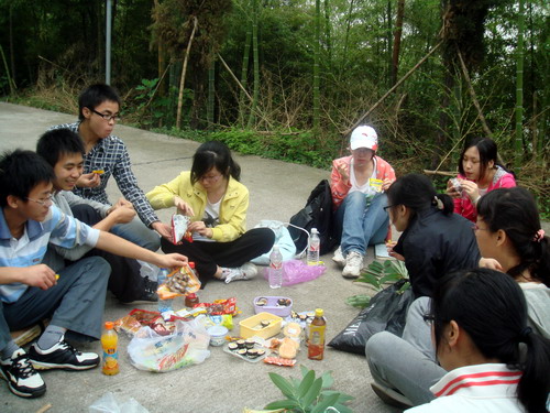 14、午餐时分一:分享食物分享快乐。瞧,那做工精美的寿司可是咱女生们于前一天在寝室里亲手做的哦。
