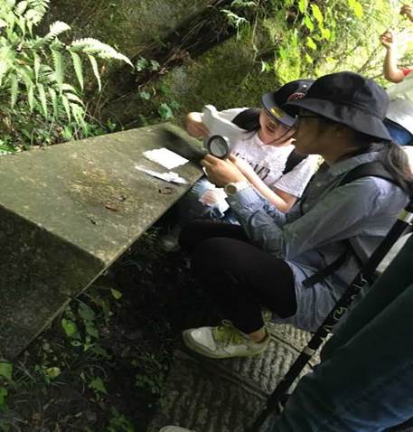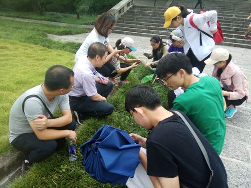就地施教:在忠烈祠草地里发现目标。刘韶教授在讲解。